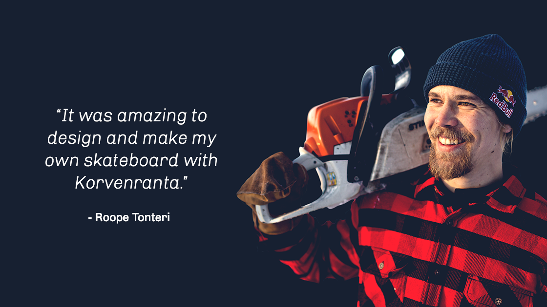 We asked snow- and skateboarder Roope Tonteri to design and test the skateboard. The final result was a signature cruiser board for Roope and for Korvenranta. Roope Tonteri has won three gold medals as a junior and a silver medal as a pro in the Finnish skateboarding championships. He is also a three-time world champion in snowboarding and has represented Finland twice in the winter Olympics. Roope is now aiming for a spot at the Tokyo summer Olympics. We wish him all the luck!
